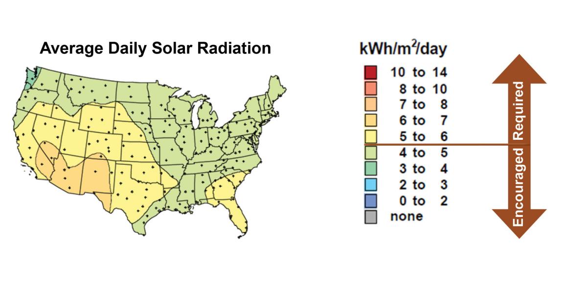 - Location, based on zip code, has at least 5 kWh/m2/day average daily solar radiation based on annual solar insolation using the PVWatts online tool. See map below.