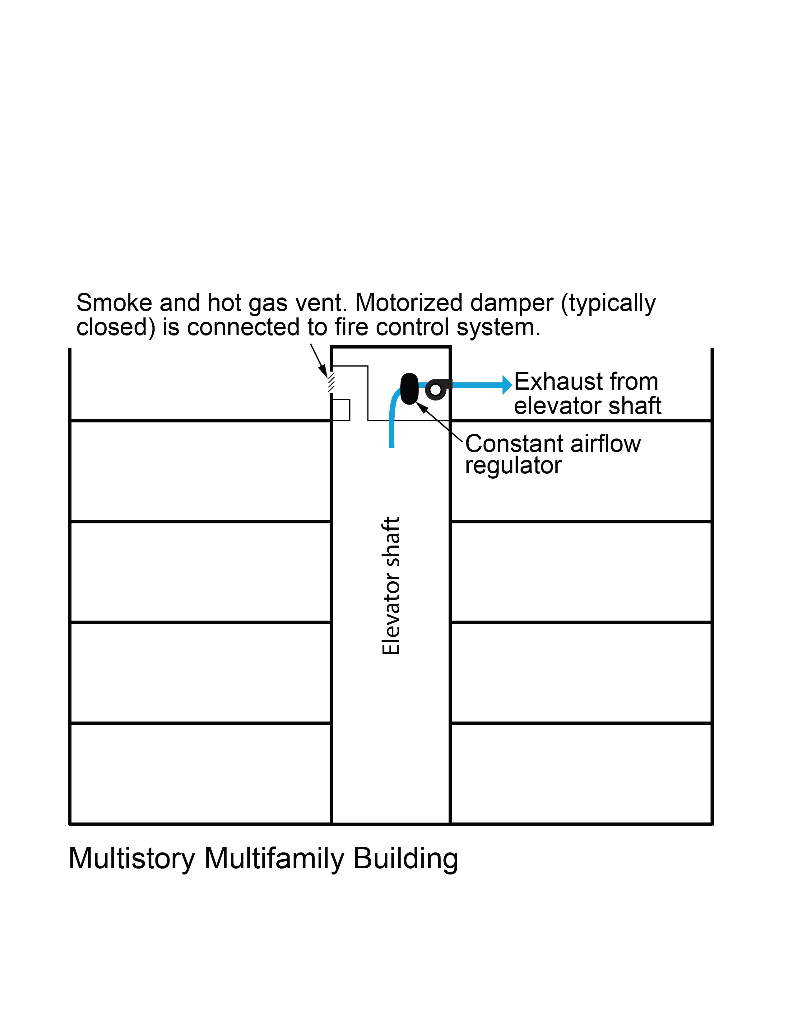 During normal operation, it is best practice to depressurize elevator shafts to keep elevator equipment odors from migrating into corridors and occupied spaces. Figure 2 shows a system for maintaining a slight negative pressure in the building’s elevator shaft during normal operation. The negative pressure is maintained in a controlled manner with a constant airflow regulator (or another method for airflow balancing and control). As exterior temperatures drop, the stack effect forces increase. To avoid excessive negative pressures in the elevator shaft, the constant airflow regulator maintains a constant exhaust flow by restricting the opening to the exhaust fan.