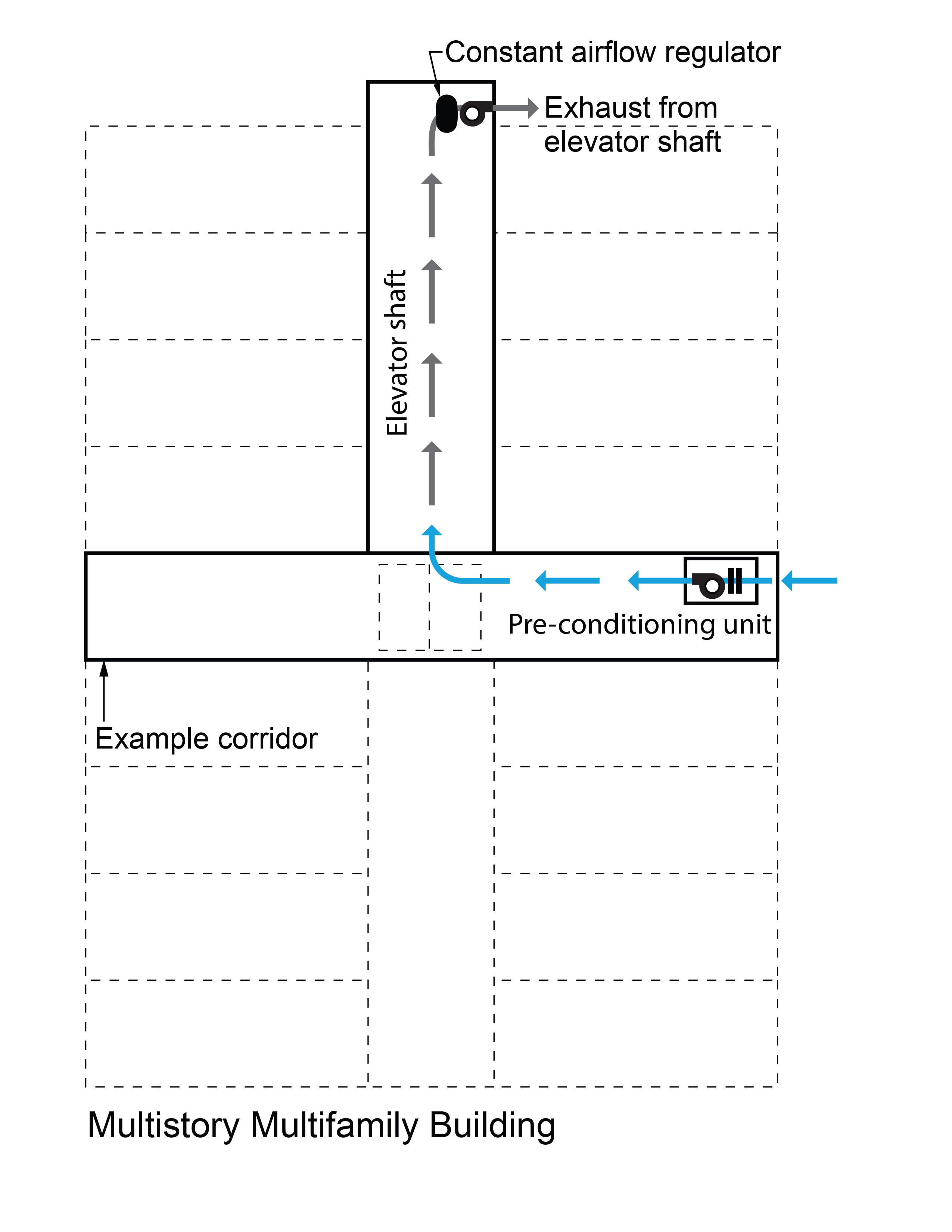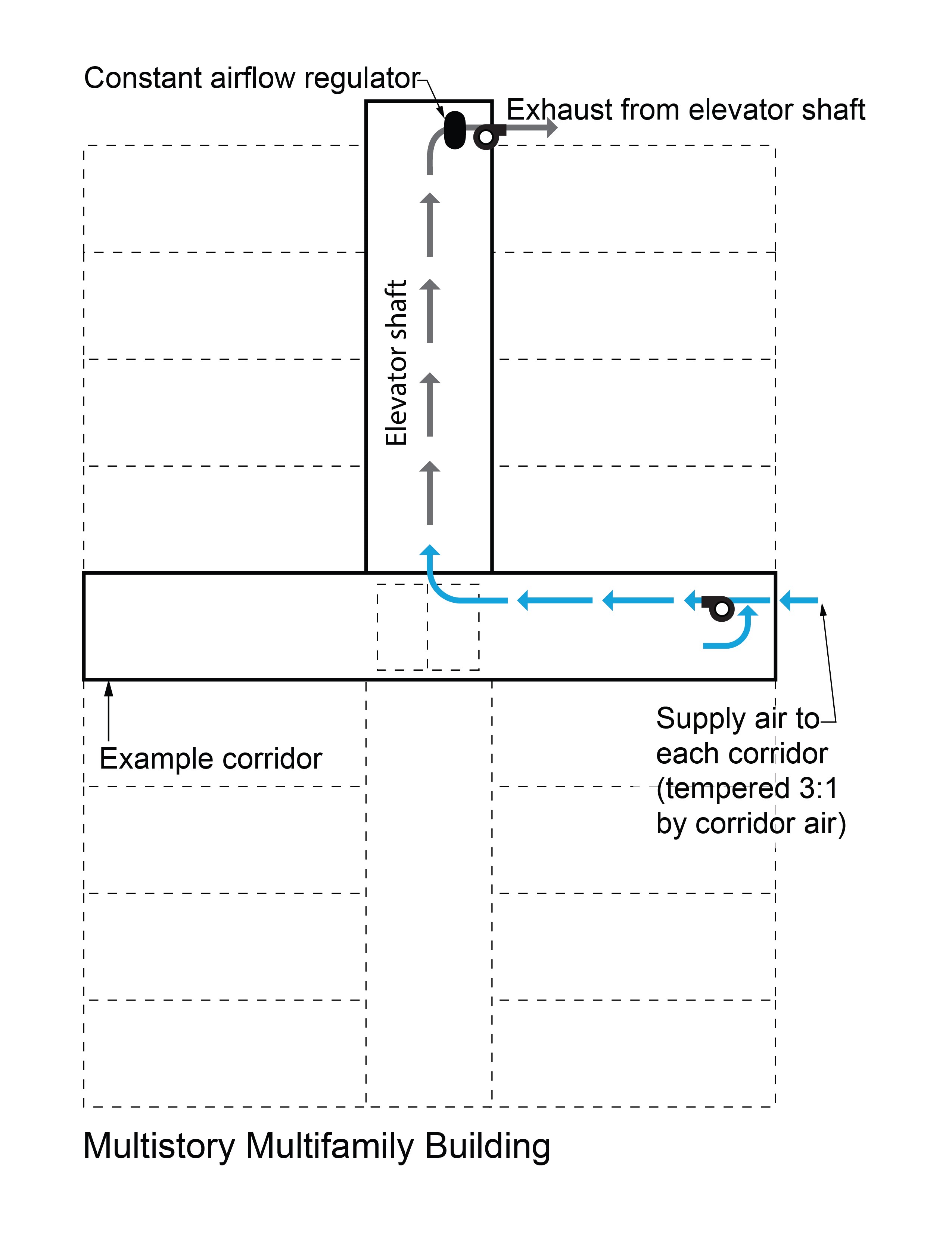 During normal operation, it is best practice to pressurize corridors relative to individual unit spaces to control odors and facilitate indoor air quality. Figure 3 shows an approach to pressurize the corridors on each floor of a building with fan-powered outdoor supply air that is tempered by mixing with indoor corridor air. The air supplied to pressurized corridors provides make-up air for the elevator shaft that is depressurized by the elevator exhaust fan and the stack effect.