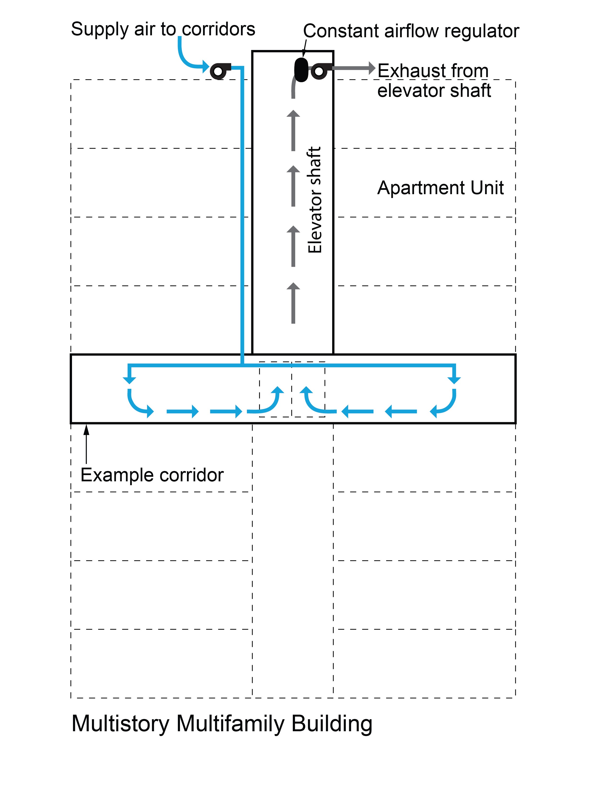 All airflow systems in multistory multifamily buildings affect each other, so it is important to design systems that can pressurize or depressurize certain areas within the building in order to control airflow between spaces. Controlling airflow between spaces contributes to limiting indoor odors and maintaining indoor air quality. The following section discusses methods and systems for pressurizing and depressurizing spaces in multistory multifamily buildings.
