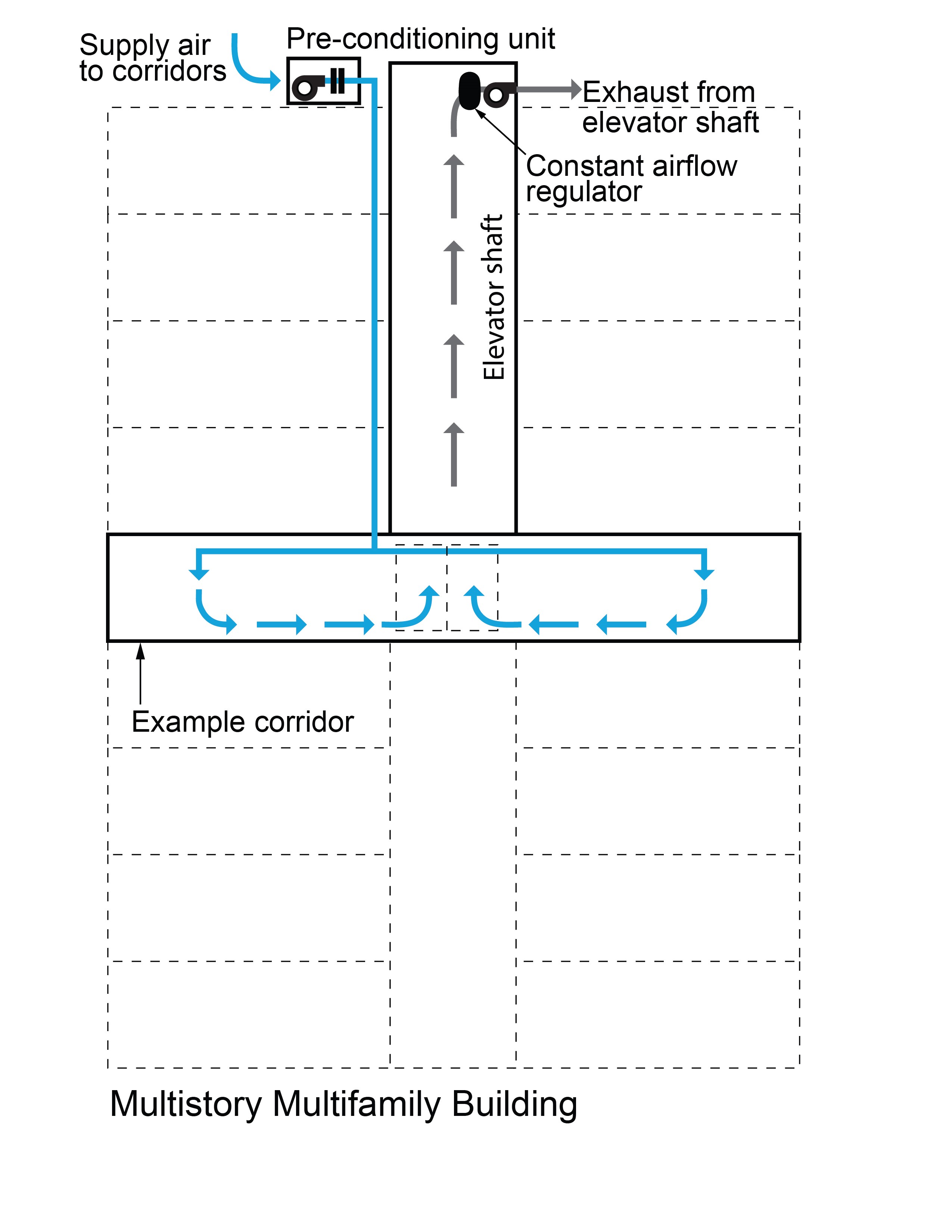 Figure 4 shows an approach where the outdoor supply air is preconditioned prior to supplying it to the corridors on each floor of a multistory multifamily building.