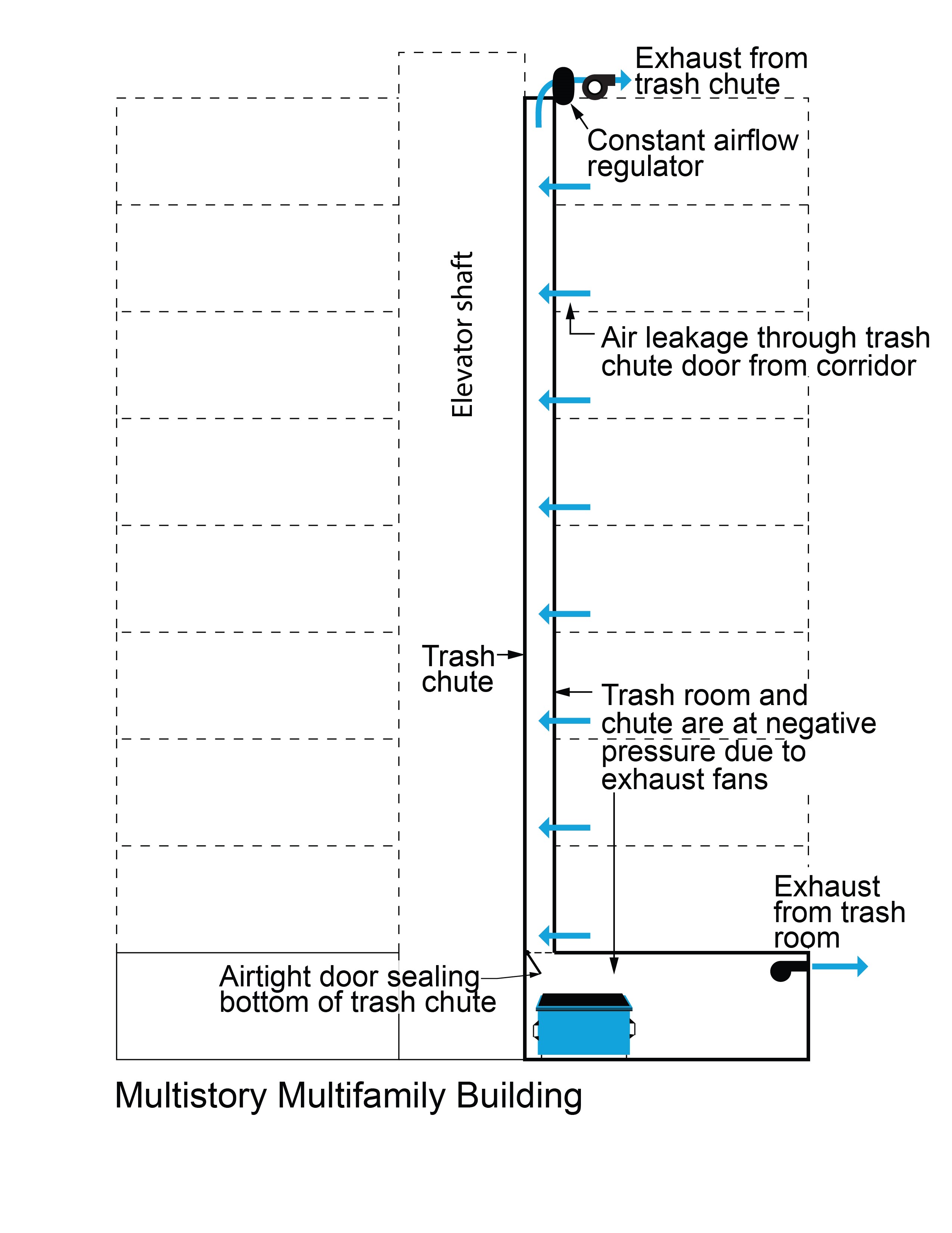 This guide discusses the importance of airflow control in stairwells, elevator shafts, and trash chutes in multistory multifamily buildings. Controlling airflow into and out of these spaces is key for odor control, energy efficiency, and life safety (during fire and smoke events). These systems should be professionally designed for each specific building. This guide provides general concepts; it should not take the place of an actual engineered design. This guide discusses operation during normal (non-fire and non-smoke) conditions. Operation during emergency conditions may change based on the engineered design and control scheme for the building. This guide is not intended to advise or provide specific fire and smoke control strategies.