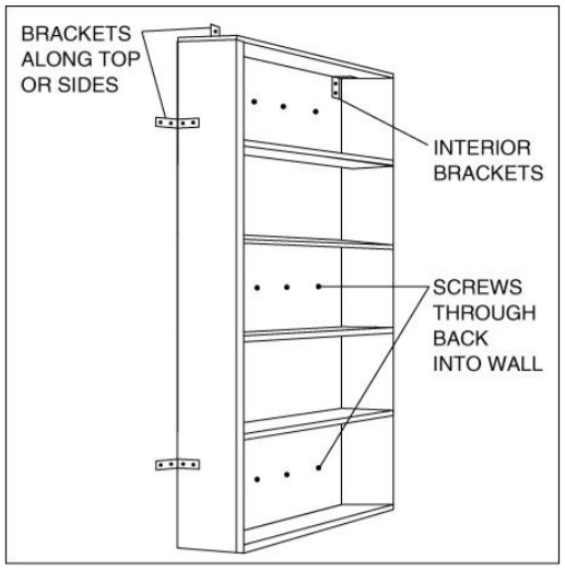 Furniture and Bookcases. Large pieces of furniture such as tall bookcases and file cabinets can topple in the event of an earthquake or pose a tip-over hazard for small children. Anchoring furniture can prevent injuries as well as protect the furniture itself (FEMA 2008). Make sure that all anchoring screws penetrate not just the wall but the studs behind it as well. Screws embedded only in drywall or plaster will pull out. Regardless of the anchoring method, screws should be long enough to extend at least 2 inches into the wall and wall studs (FEMA 2008). When anchoring a bookcase to the wall, use L brackets that are screwed into wall studs and into sturdy parts of the shelving unit such as the top or sides (Figure 8). Use the bracket provided with the shelf, or after-market furniture anchors are available. Do not attach brackets or anchoring screws to the bookcase backing, which is often thin paneling or pressboard that is not a structural part of the shelving unit. Many file cabinets come with lockable and self-latching drawers. If installing file cabinets without self-latching drawers, add latches. Two or more bookcases or file cabinets that sit next to each other should be connected to each other as well to the wall (FEMA 2008). Make sure framed art and mirrors are securely attached to walls; consider using hook-and-loop or adhesive fasteners in addition to wire hangers to prevent frames from swinging or banging against walls during seismic events. Do not hang heavy art on the walls above beds or cribs. Choose chandeliers and light fixtures that have all components (glass globes around individual lights, etc.) mechanically attached, not just sitting in place, and ensure the fixtures are securely attached; reinforce hanging wires or cables if necessary.