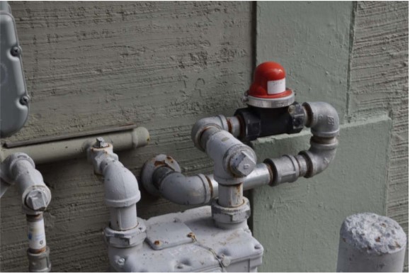 Homes that are equipped with a gas line that runs from the utility line to the home should have an automatic gas shut-off valve (ASV) (Figure 1), which is a valve that shuts off the flow of gas into a home due to an earthquake or other event that causes a rupture of the gas line, thus reducing the chance of explosion or fires from leaking gas. Shaking or movement of a building or the appliances in the home in the event of an earthquake or other natural disaster can cause damage to the gas piping and appliances, causing the accidental release of natural gas, which can lead to fires or explosions. Structural weaknesses, the absence of appliance anchors, and lack of flexible pipe connectors can all contribute to a greater possibility of gas leaks (Danville 2021).