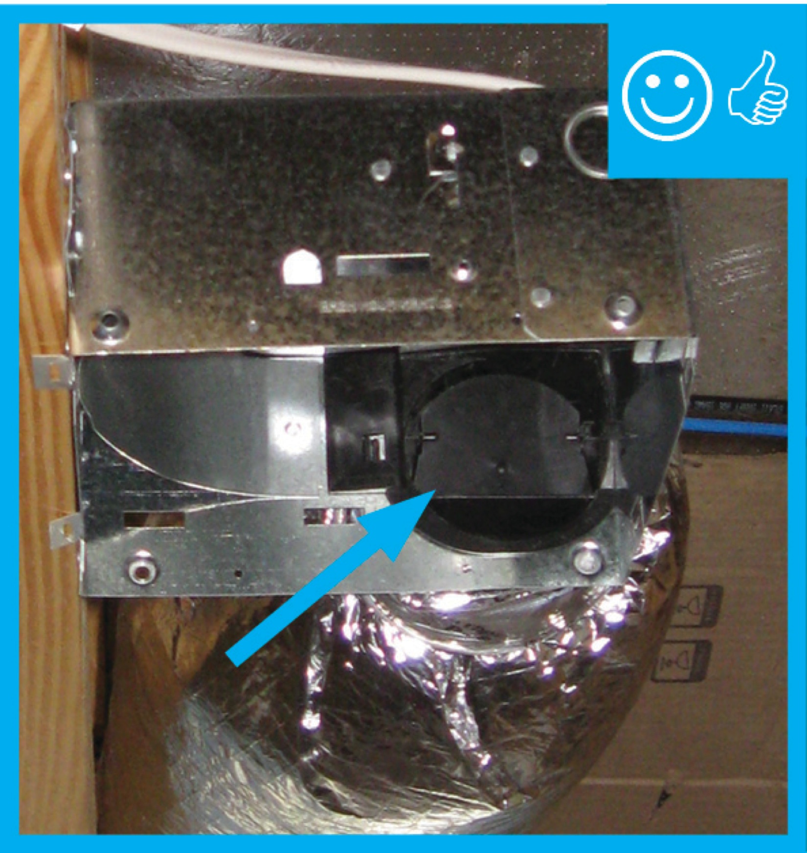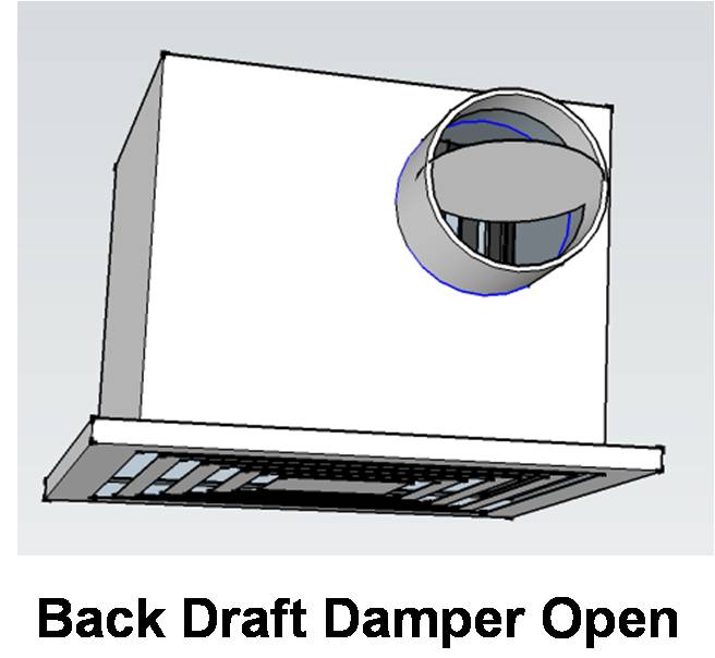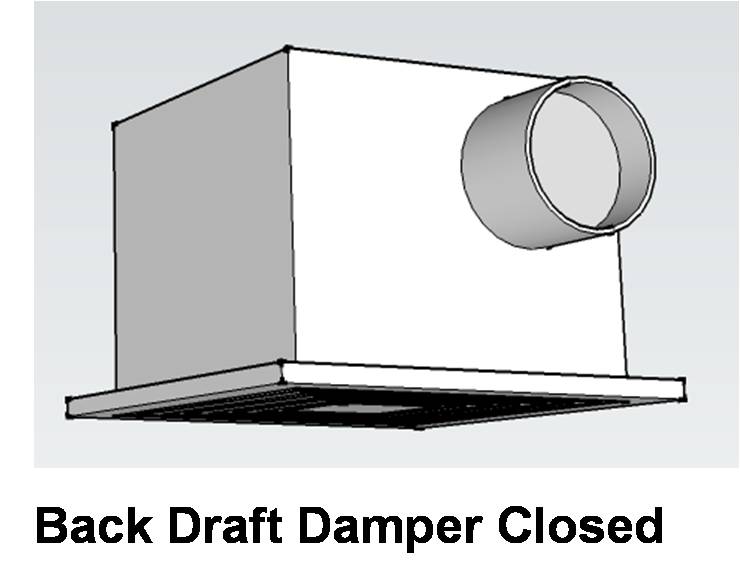 - Install back-draft dampers where the exhaust duct meets the exhaust fan in each fan unit. The dampers should open when the fan is actively exhausting and should shut when the fan is off (Figures 1 and 2). When the exhaust fan is operating, the back-draft damper is pushed open by airflow to allow air to exit through the exhaust duct (Figure 3).