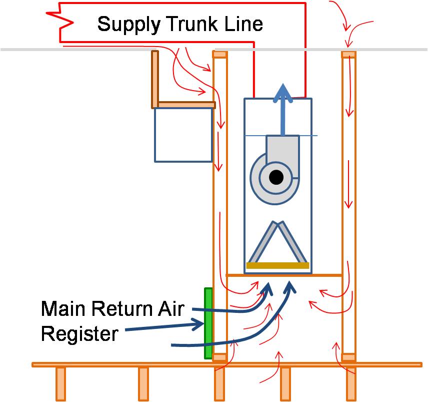 Other common framing cavities used as return air pathways or plenums are air handler platforms, open floor truss cavities, and dropped ceilings.