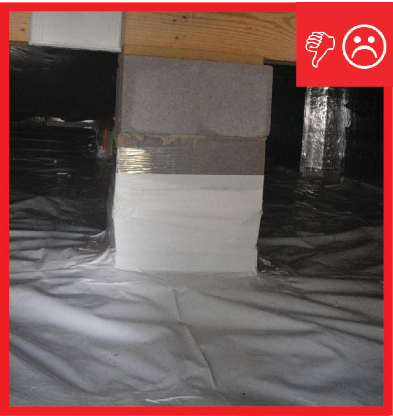Investigate the crawlspace of an existing home to determine whether the home has a vapor barrier covering the crawlspace floor and what state it is in. If no vapor barrier is present, install one as outlined in the Description tab. If a 6-mil vapor barrier is present in the crawlspace but it is unsealed at the seams, or not attached to walls or piers, it may be possible to repair it by taping any tears, overlapping and taping any seams, and attaching pieces with house wrap tape or another compatible sealing tape to extend the vapor barrier up the walls. The barrier should be fastened to the walls and piers with furring strips or other mechanical fasteners as described in the Description tab. Another, more durable, option is to cover the existing vapor barrier with a new layer of ≥ 6-mil polyethylene then seal that layer at all seams and secure it to the walls and piers as described in the Description tab.