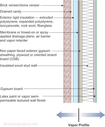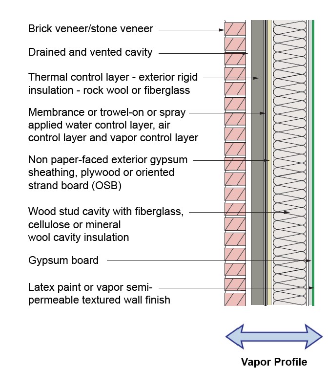 - Use materials in the wall assembly that can safely store water. These include solid wood, treated cellulose, and plywood. Try to avoid materials that are susceptible to moisture such as OSB and paper-faced gypsum. Also, be aware that many modern materials such as fiberglass, fiberglass-faced gypsum, and foams have little to no moisture storage capacity and can therefore concentrate moisture on more sensitive materials within the wall assembly.