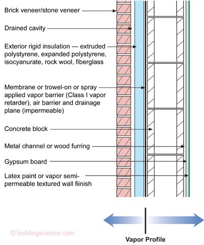 - Thick layers of exterior insulation will keep the sheathing and other condensing surfaces warm throughout the winter. Using this approach, the structural layers of the wall are effectively part of the interior climate and can therefore dry to the inside. The exterior insulation may be vapor impermeable (such as rigid XPS foam, foil-faced foam, and closed-cell spray foam) and it becomes important not to restrict drying to the interior. In this case, weaker vapor retarders such as Class 3 or “smart” vapor retarders are desirable on the inside (warm in winter side) of the wall. Residential building codes provide guidance on how much exterior insulation should be used in combination with warm-side Class 3 vapor retarders.