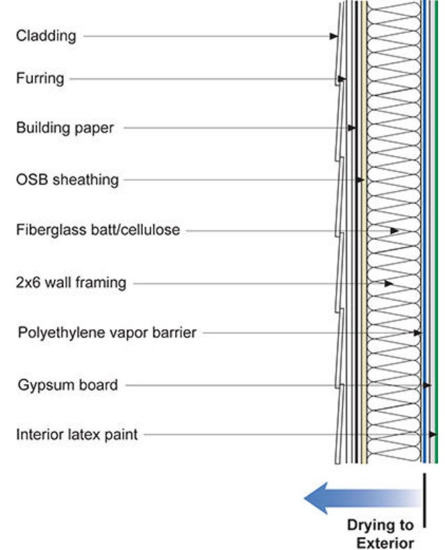 - In cold climates, most wall types dry to the outside. To maintain this critical drying pathway, avoid using vapor-closed products on the exterior side of the wall, which can create a cold-side vapor retarder. Examples of vapor closed products include low-perm peel and stick membranes, XPS foam, foil-faced products, and some types of insulated siding installed without back-ventilation.
