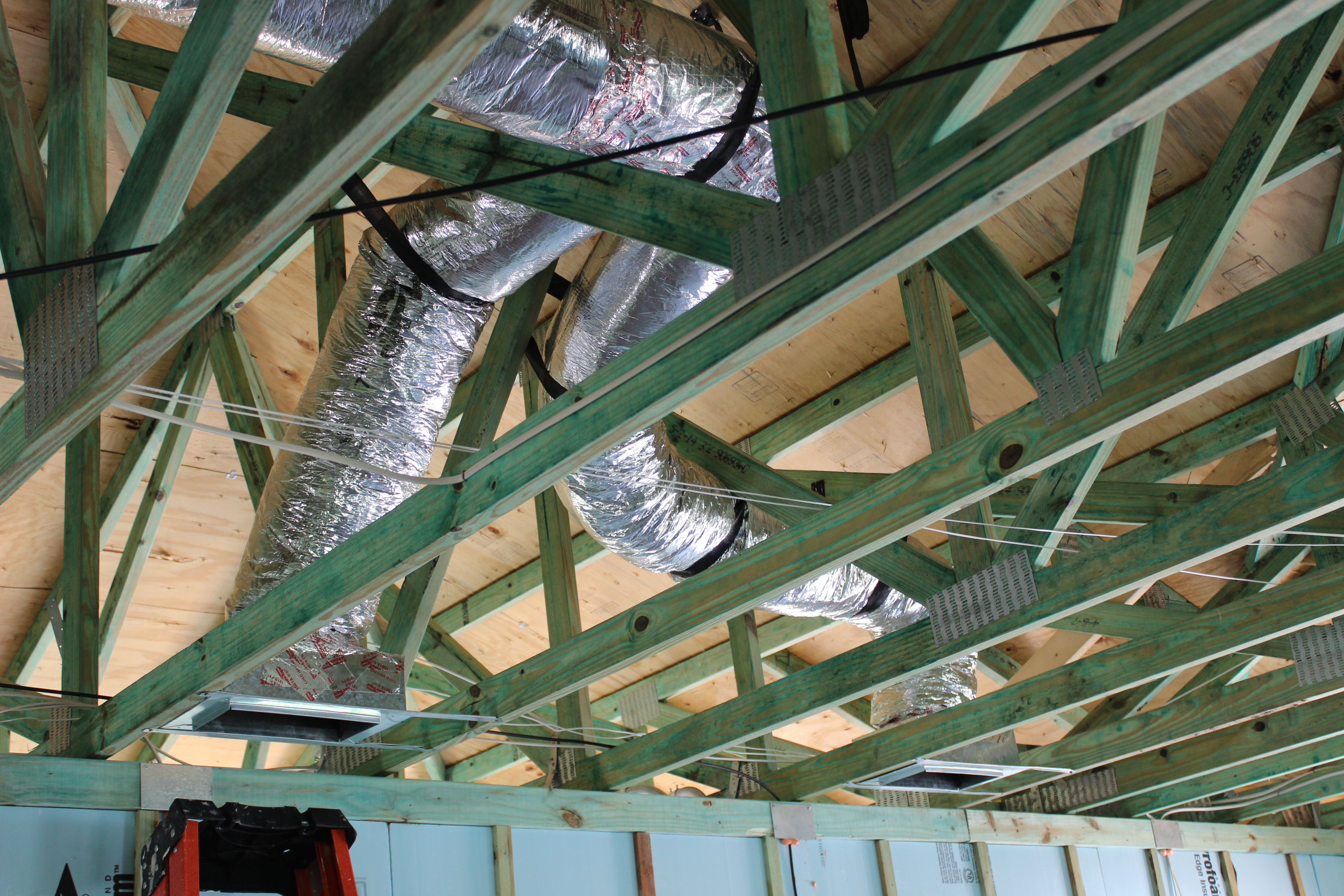 Figure 10. These ducts were installed before the ceiling drywall was installed. Ducts are supported by temporary strapping across the lower truss cords. (Source: Steven Winter Associates.) - Connect, seal, and test ducts as described above in Steps 3 and 4.