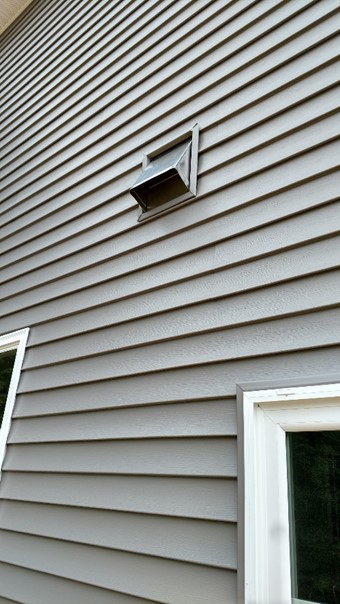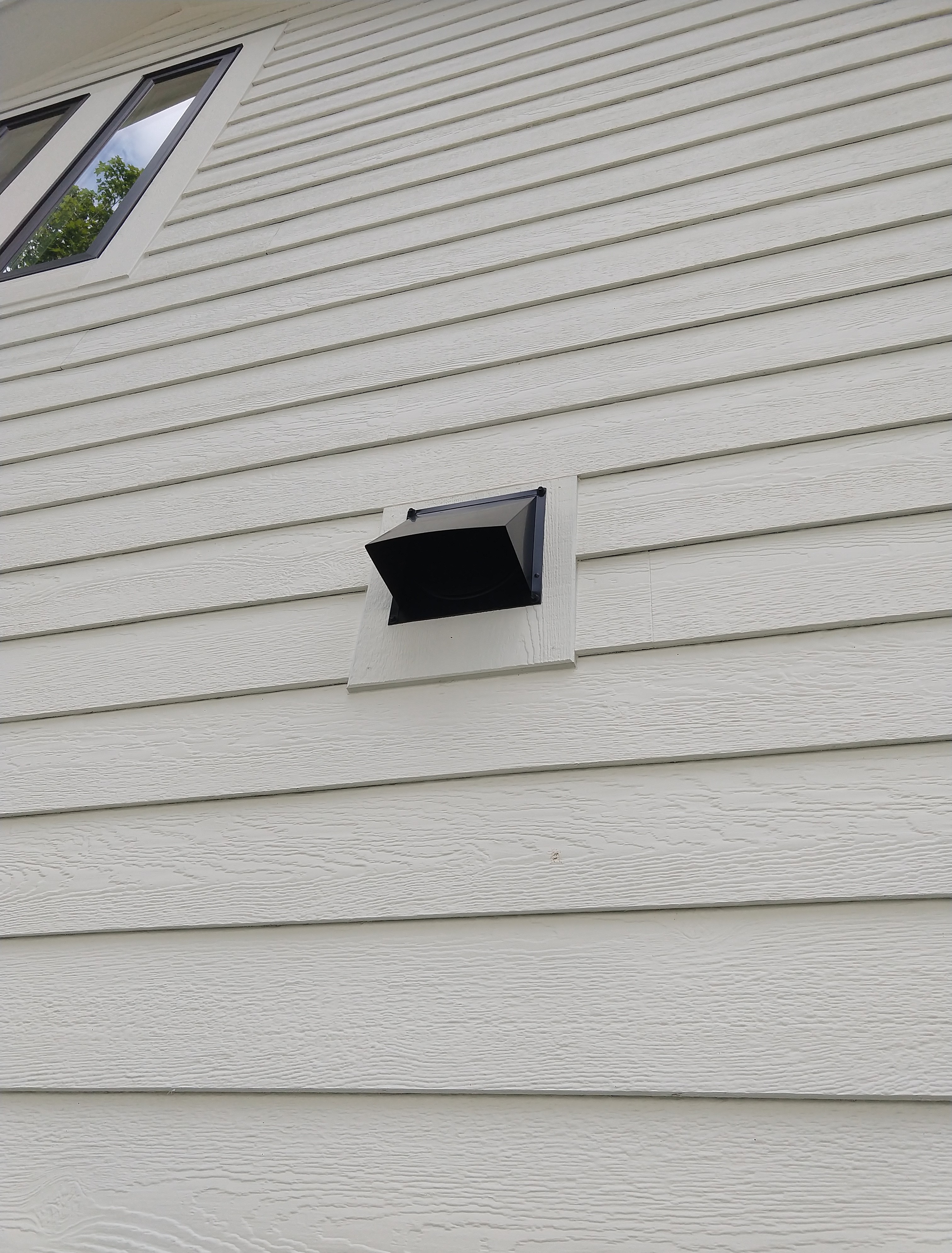 The penetration in the exterior building envelope must be flashed to prevent the intrusion of bulk moisture and must be sealed with caulk, foam, or a gasket to prevent air leakage through the building envelope. The duct termination must be covered with louvers, a screen, or a grille to protect the exhaust duct from weather and pests. The EPA Indoor airPLUS program requires a pest screen at exhaust terminations. Duct terminations should be integrated aesthetically with the exterior cladding. Installations of kitchen exhaust ducts often do not take into account how to integrate the duct termination with the exterior cladding, resulting in a termination grille that is simply screwed on top of the exterior siding. Planning the installation of cladding finishing pieces as part of the work will help avoid an eyesore at the end of the project.