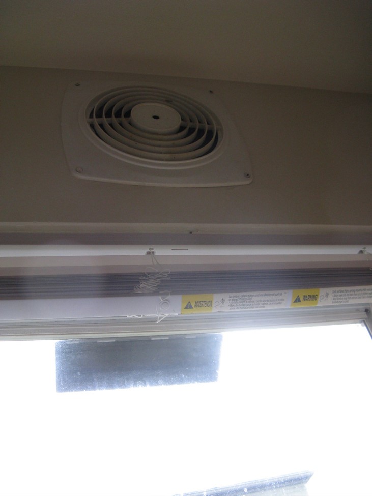 Example Scenario: A kitchen on an exterior wall had a range installed immediately next to an operable window during a previous kitchen renovation. An exhaust duct installed above the range directly through the exterior wall will exhaust too close to the window, violating code and allowing odors and kitchen pollutants to re-enter the space when the window is open. A solution may be to route the duct vertically through the roof or at least high enough on the wall to terminate at least three feet from the window. Another solution might be to convert the window to a section of solid wall.