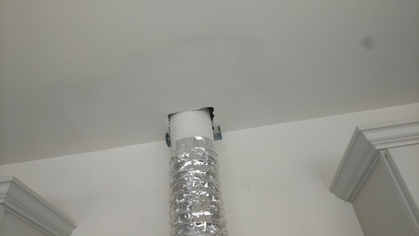 To ensure the duct is correctly sized, refer to the manufacturer’s installation instructions for duct size. The larger the duct, the less it will restrict air flow. Using a duct that is too small for the required air flow will significantly reduce the achieved flow rate. To achieve the rated air flow of the selected fan, the correct duct size is needed. The size recommended by the manufacturer will vary by model and sometimes by exit direction (horizontal or vertical duct). Depending on the exit option selected, an exhaust system may require a round or rectangular duct. For example, a range hood might use a 6-in. round duct or an equivalent 3.25 x 10-in. rectangular duct. Ducts can be transitioned from rectangular to round via connector pieces. Cut openings in the ceiling or wall for the exhaust duct no wider than needed to fit the duct and any needed insulation. An opening that is too small will not allow installation of the duct. An opening that is too large will complicate air sealing measures and may require additional supports.