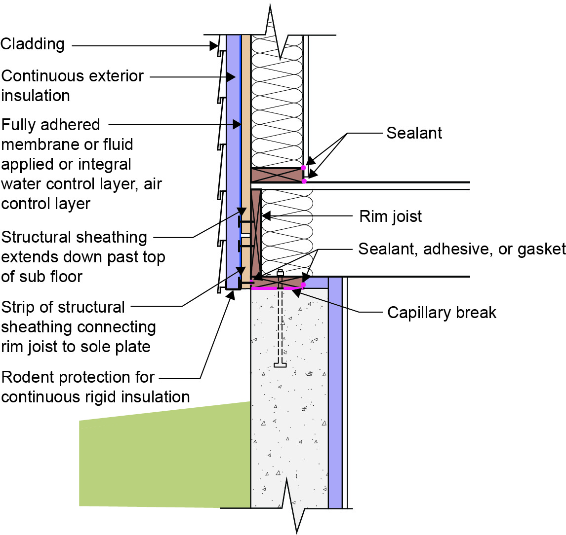 During warm seasons in mixed-humid and humid climates, the outside air can contain more water vapor than the air within the crawlspace. Thus, a closed crawlspace reduces the potential for moisture problems (e.g., condensation, mold growth, wood rot) within the crawlspace. Local building codes can have specific requirements for types of insulation and requirements for the 3-in. pest control inspection strip at the top of the foundation wall.