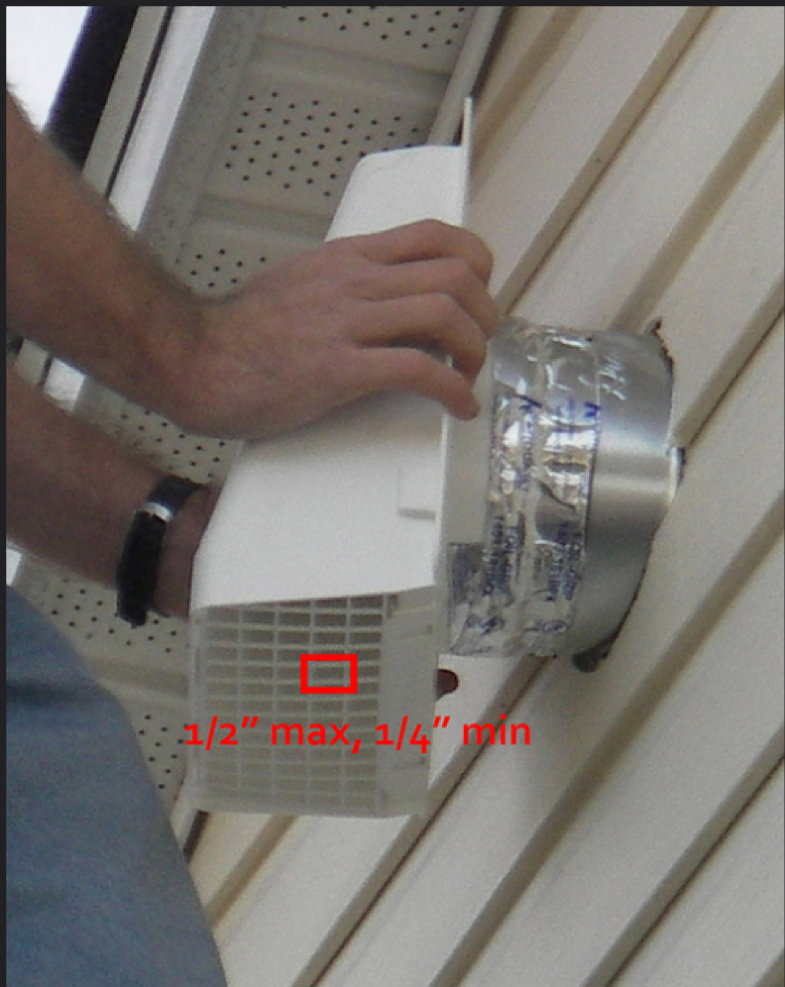 Caution: Hardware cloth less than 1/2 x 1/2 inch (1.3 x 1.3 cm) significantly reduces air flow. In some locations, small-mesh screens can become clogged with dust or freeze over. Hardware cloth covering air handler intake vents should not be less than 1/2 x 1/2 inch (1.3 x 1.3 cm), unless the covering is recommended by the manufacturer. Instruct the homeowner to periodically clean the screen.