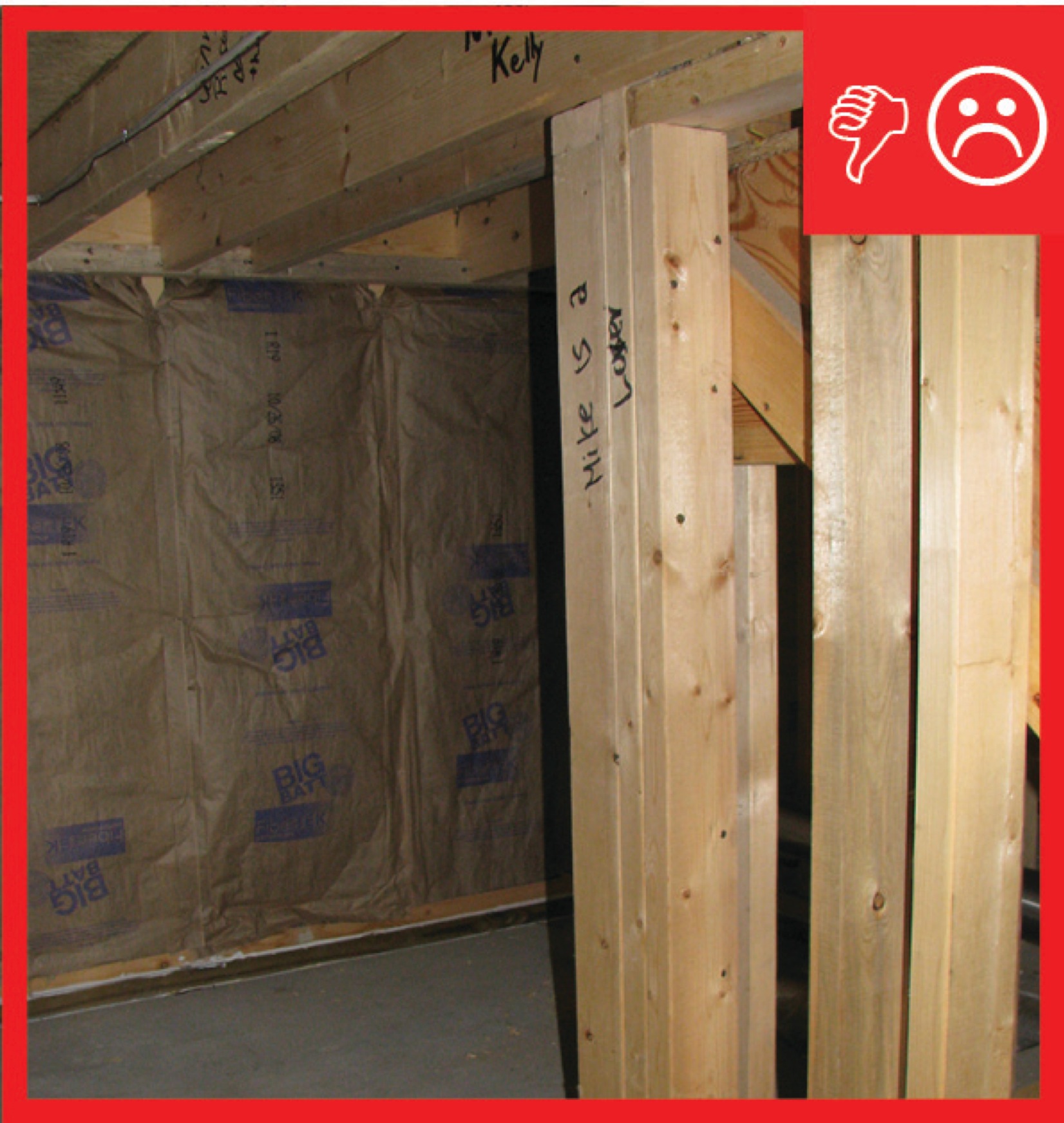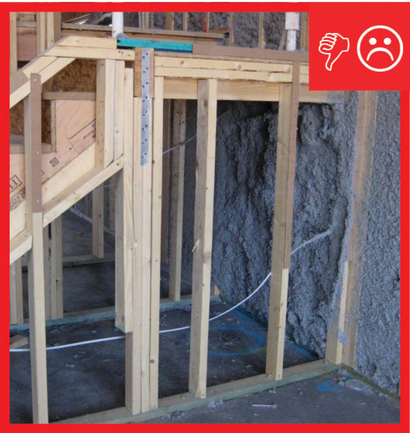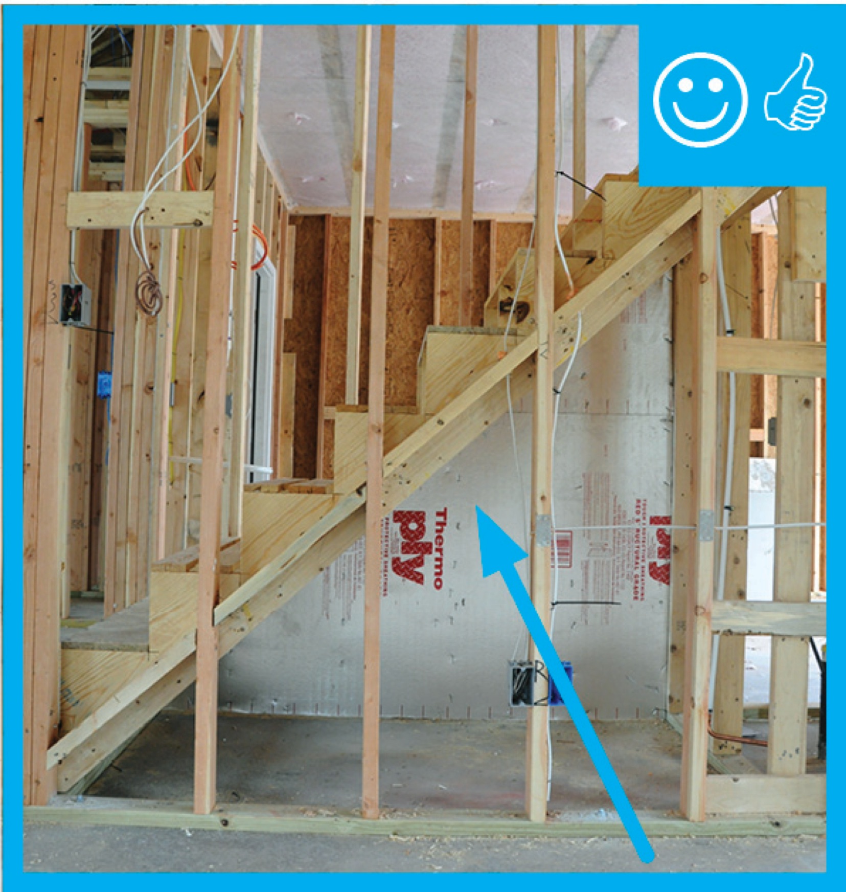 The site supervisor should visually inspect the exterior wall underneath staircases or staircase landings located on exterior walls during construction to confirm that the wall cavity is insulated and that a rigid air barrier material is installed on the interior surface of the exterior wall in contact with the cavity insulation. Blower door testing conducted as part of whole-house energy performance testing may help indicate if there are air leaks at staircases. High-performance branding programs and the 2009 and 2012 IECC require that builders meet specified insulation levels and infiltration rates. See the Compliance tab for these specified infiltration rates.