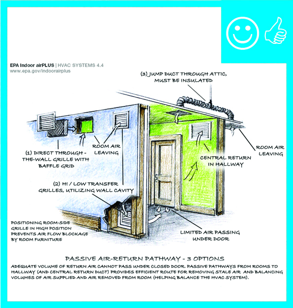 - Install ducted returns or a combination of ducted returns, transfer grilles, jump ducts, and/or door undercuts in bedrooms to allow pressure balancing between bedrooms and the rest of the house in homes with ducted heating and cooling systems by providing a path for stale air to return to the return side of a central air handler.