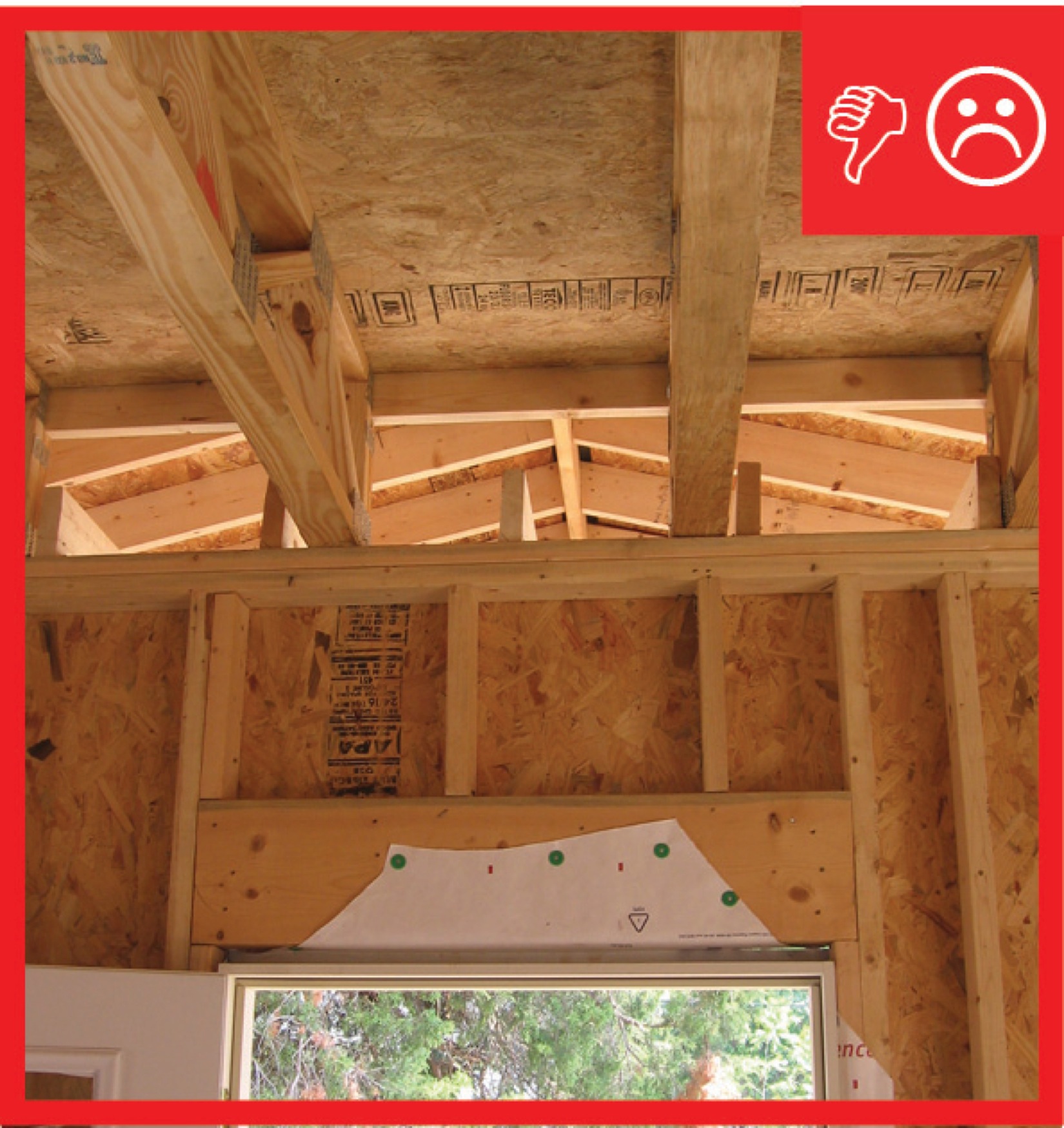 Ideally the exterior sheathing of a house will run continuously along the exterior walls, even where porch framing intersects the exterior wall, such that the porch is completely separated from the conditioned part of the house. However, in existing homes, the porch is sometimes built before exterior sheathing is installed and no sheathing or solid air barrier is put in place to separate the wall from the roof. (See Figure 1 in the Description tab for a graphic representation of this concept.) Insulation is sometimes also lacking in this section of wall.